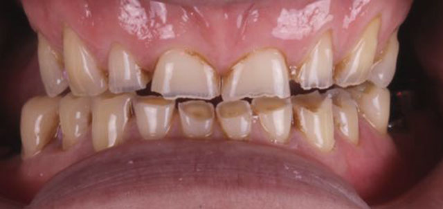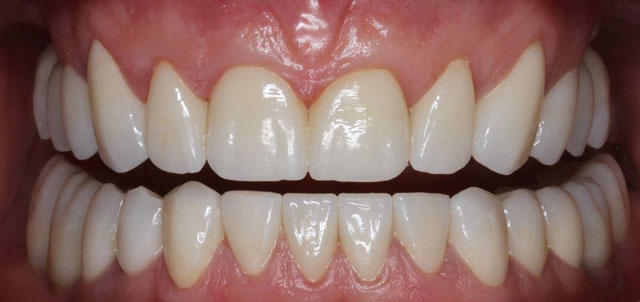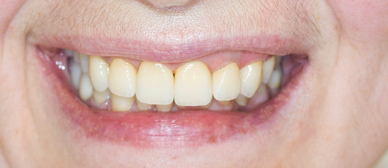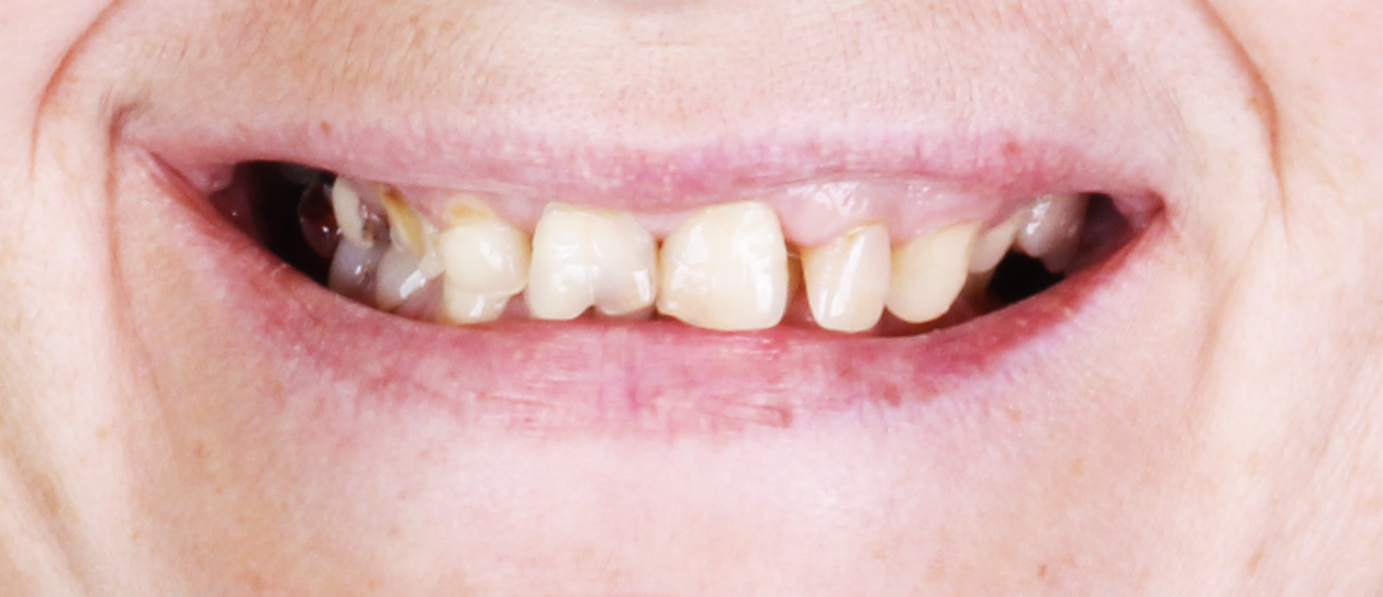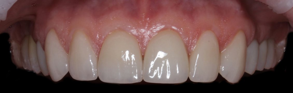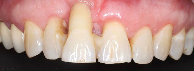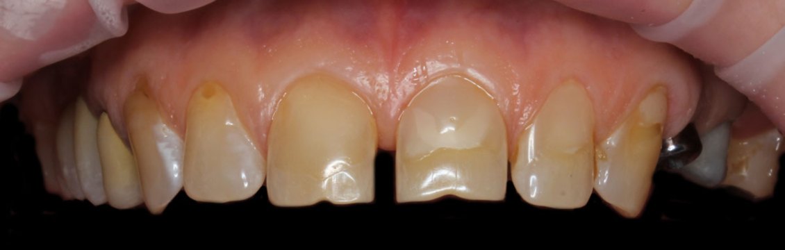 После травмы у пациента не прижились свои центральные резцы, так же произошла “убыль” десны.